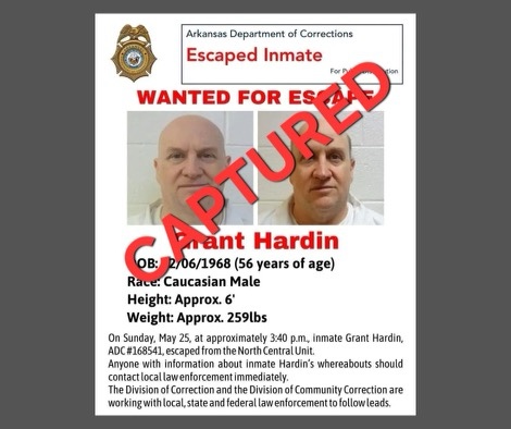 Escapee Grant Hardin was captured this afternoon approximately 1.5 miles west of the prison grounds by law enforcement officials.