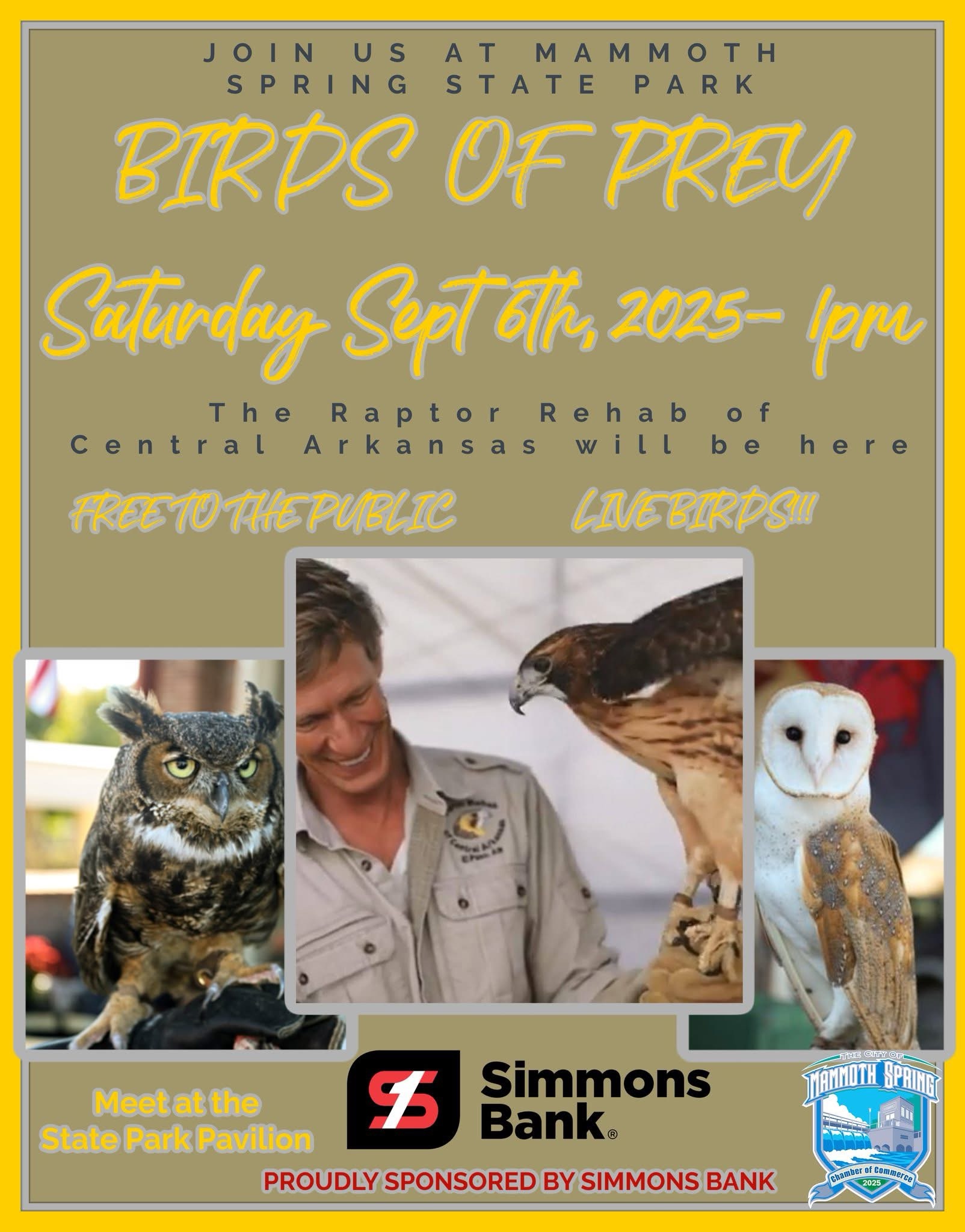 Save the date- Birds of Prey Program is returning to Mammoth Spring State Park Saturday Sept. 6th, 2025. This event is free to the public thanks to the wonderful folks at Simmons Bank. LIVE BIRDS!!