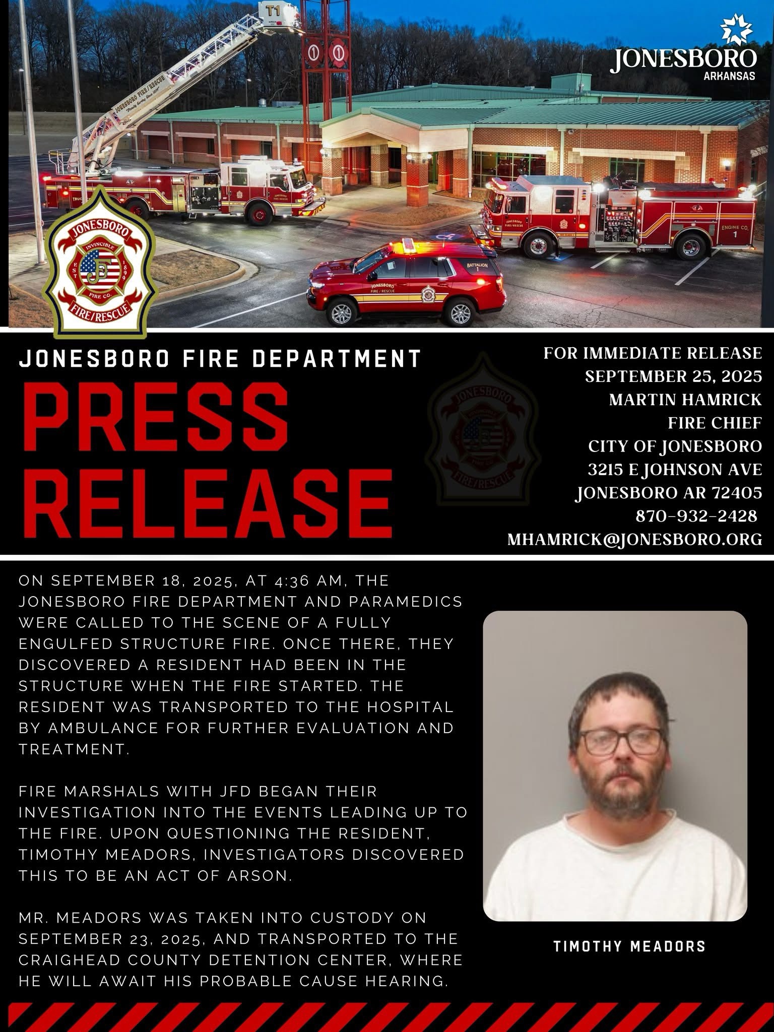 On September 18, 2025, at 4:36 AM, the Jonesboro Fire Department and paramedics were called to the scene of a fully engulfed structure fire.