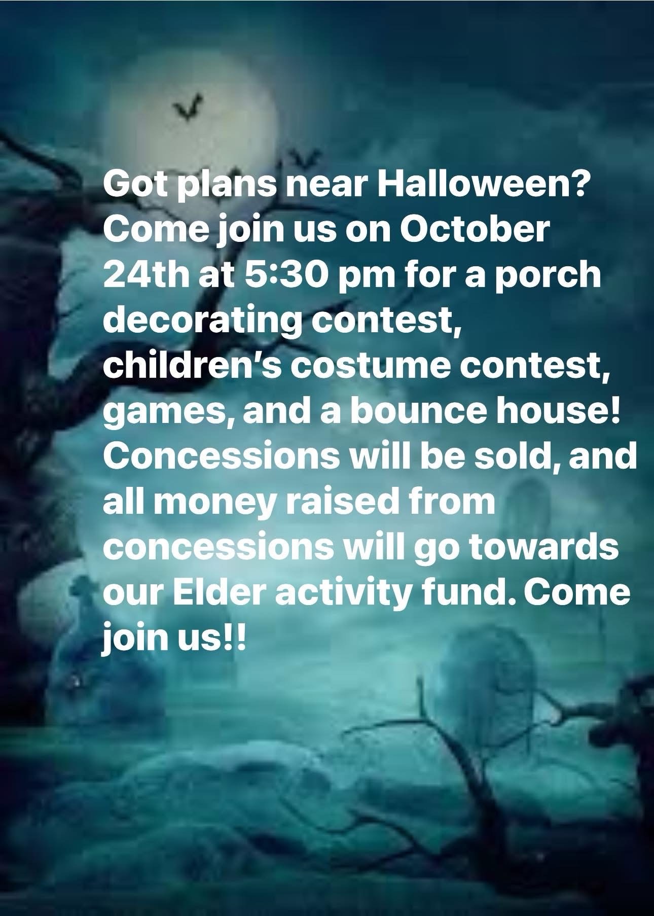There will be a bouncy house, concessions available for food, bobbing for apples, a porch decorating contest where the community votes, and our elders get to vote on a community kids costume contest, and a cake walk. The maximum age limit of the contest goes up to 12 years old. All money from concessions sold will go towards our activities fund for our elders.