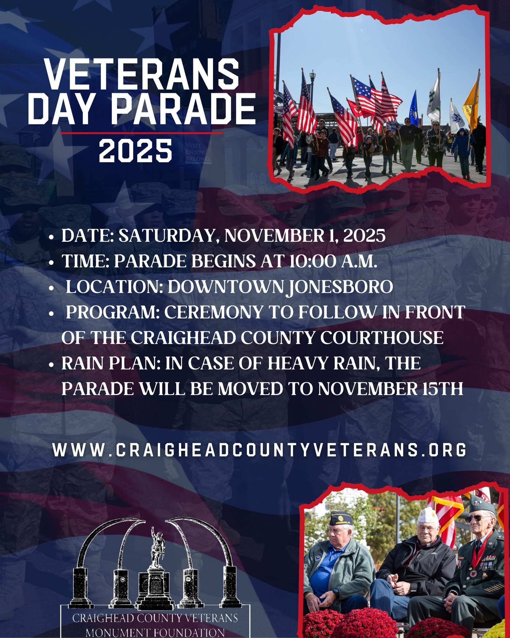 The Craighead County Veteran’s Monument Foundation invites everyone to line the streets of Downtown Jonesboro on Saturday, November 1, 2025, for the annual Veterans Day Parade — celebrating 250 years of Veterans and recognizing the Army, Navy, Marines, and all who have served.
