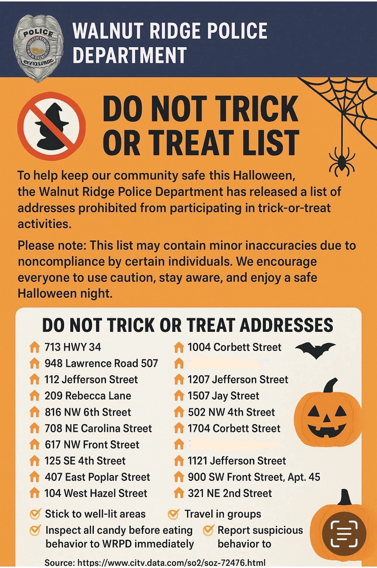Our “Thanks” to Chief Ferrell of the Walnut Ridge Police Department for releasing the “Do Not Trick Or Treat “ for Walnut Ridge.