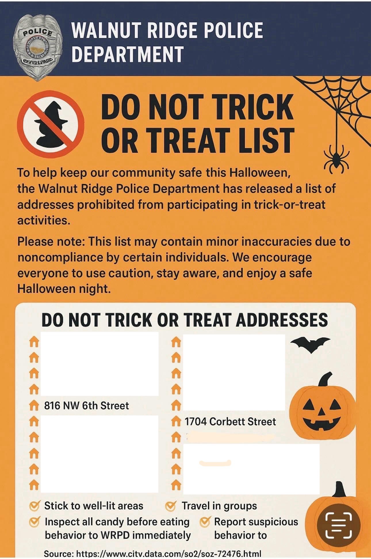 Edited List: Walnut Ridge “Do Not Trick Or Treat” List Released By WRPD