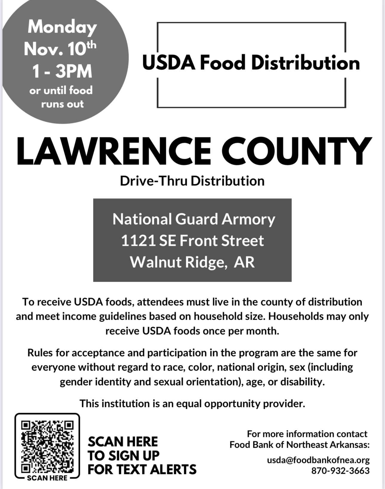 The Food Bank of Northeast Arkansas will host a drive-thru USDA food distribution in Lawrence County on Monday, November 10, 2025 from 1 – 3PM or until food runs out at the following location: