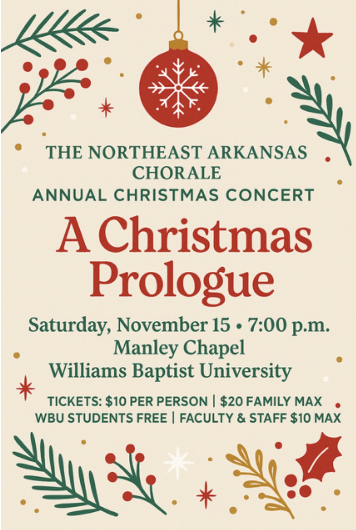 The Northeast Arkansas Chorale will be getting into the holiday spirit on Saturday, Nov. 15, when the group presents “A Christmas Prologue.” The concert, featuring a full choir and orchestra, will be held in Williams Baptist University’s Manley Chapel starting at 7:00 p.m.