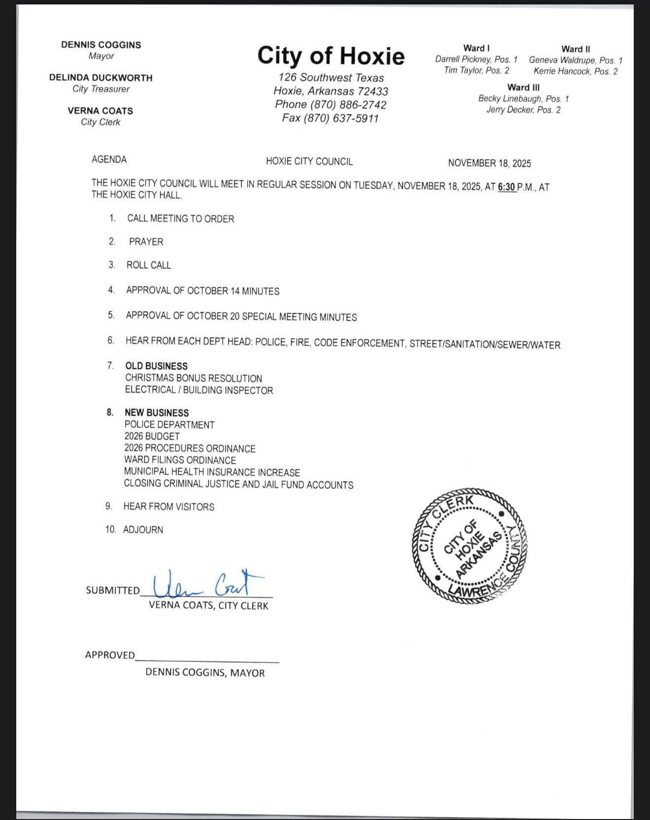 The Hoxie City Council meeting is scheduled for tonight November 18th at 6:30pm at Hoxie City Hall.