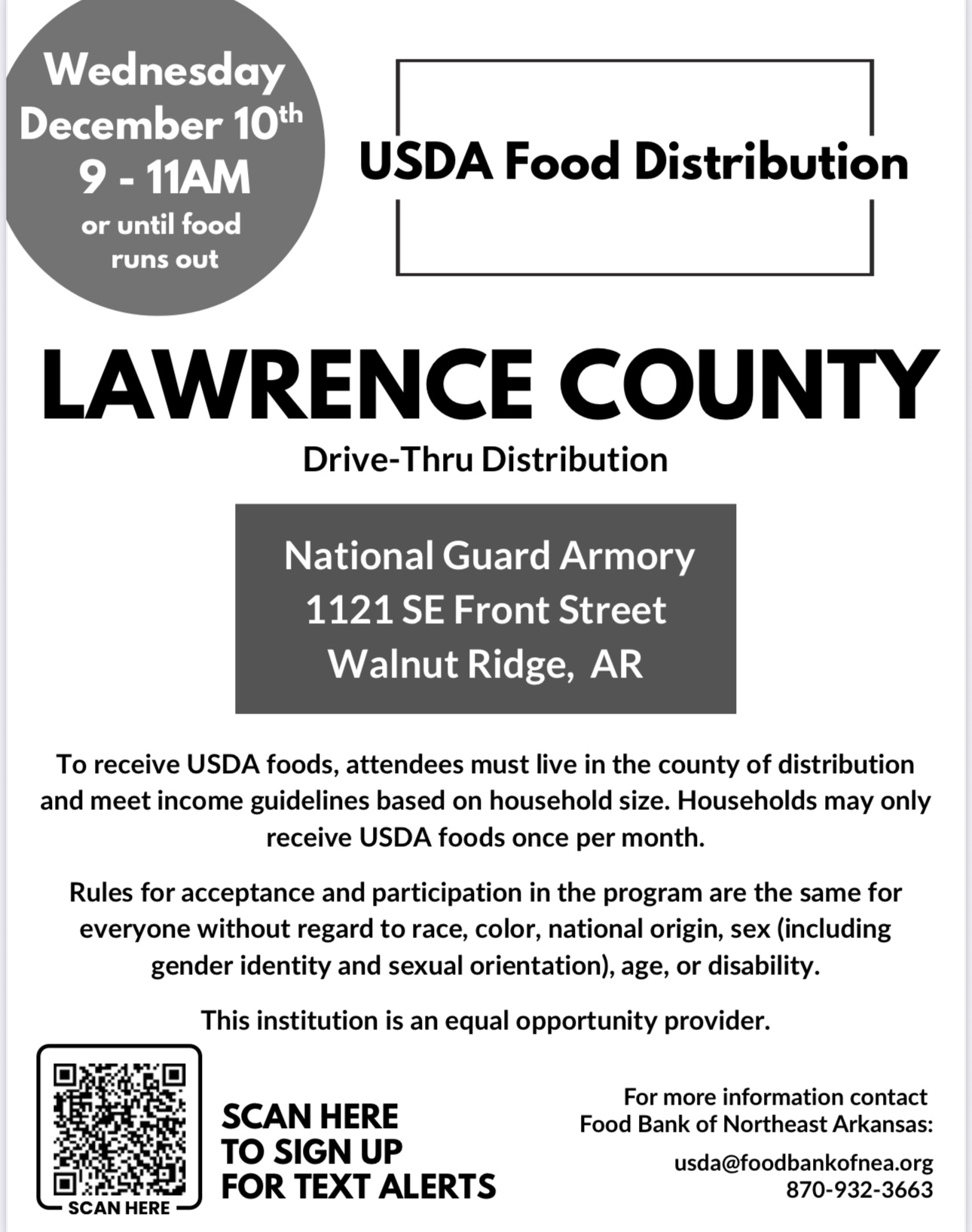 The Food Bank of Northeast Arkansas will host a drive-thru USDA food distribution in Lawrence County on Wednesday, December 10, 2025 from 9 – 11AM or until food runs out at the following location: