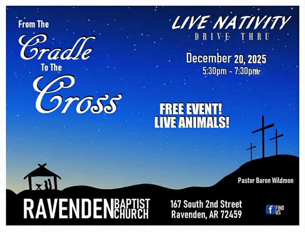 The Ravenden Baptist Church located at 167 South 2nd Street in Ravenden will host a live nativity scene.