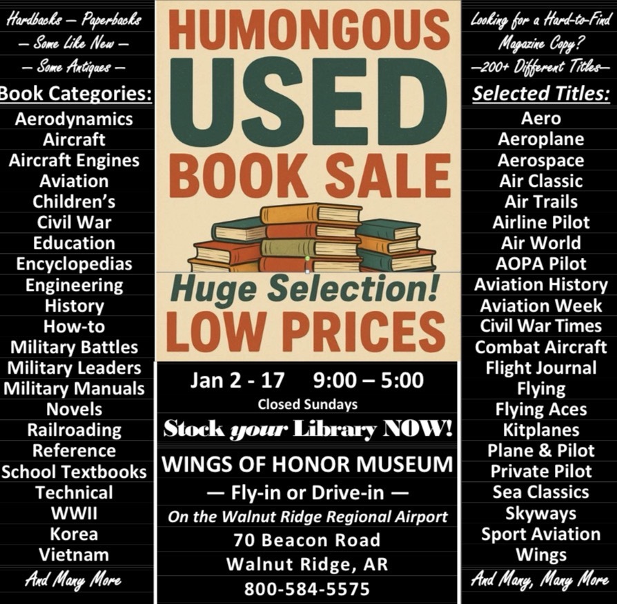 Wings of Honor Museum located on 70 Beacon Rd. Walnut Ridge will hold a used book sale January 2-17th from 9:00-5:00 (closed Sunday)