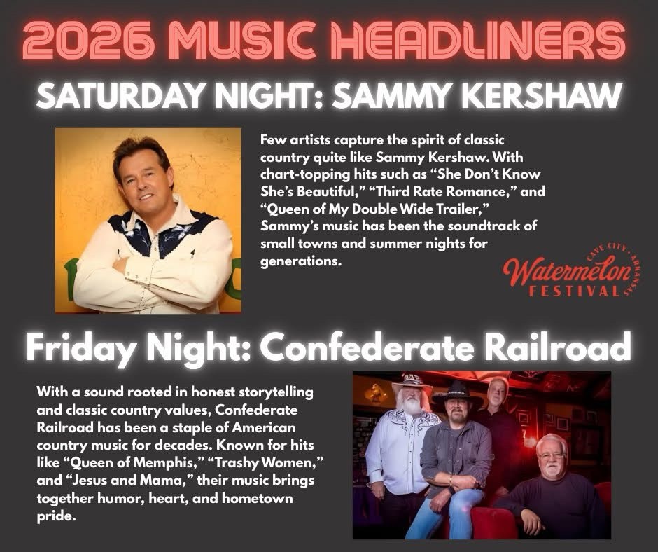 We’re proud to continue a long-standing festival tradition of bringing great live music to Cave City—and the 2026 Cave City Watermelon Festival delivers in a big way!