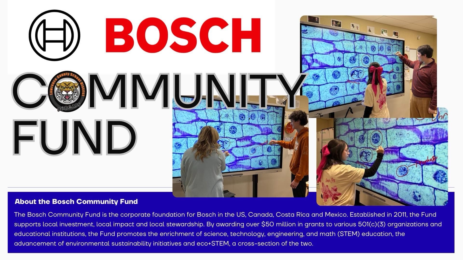 The Lawrence County School District is excited to announce a generous $18,650 grant award from the Bosch Community Fund that will boost STEM learning in our high school science classrooms and will directly support learning through the addition of several labs and new technology. We are grateful for this support, which will empower our students to build essential critical thinking, creativity, and problem-solving skills.