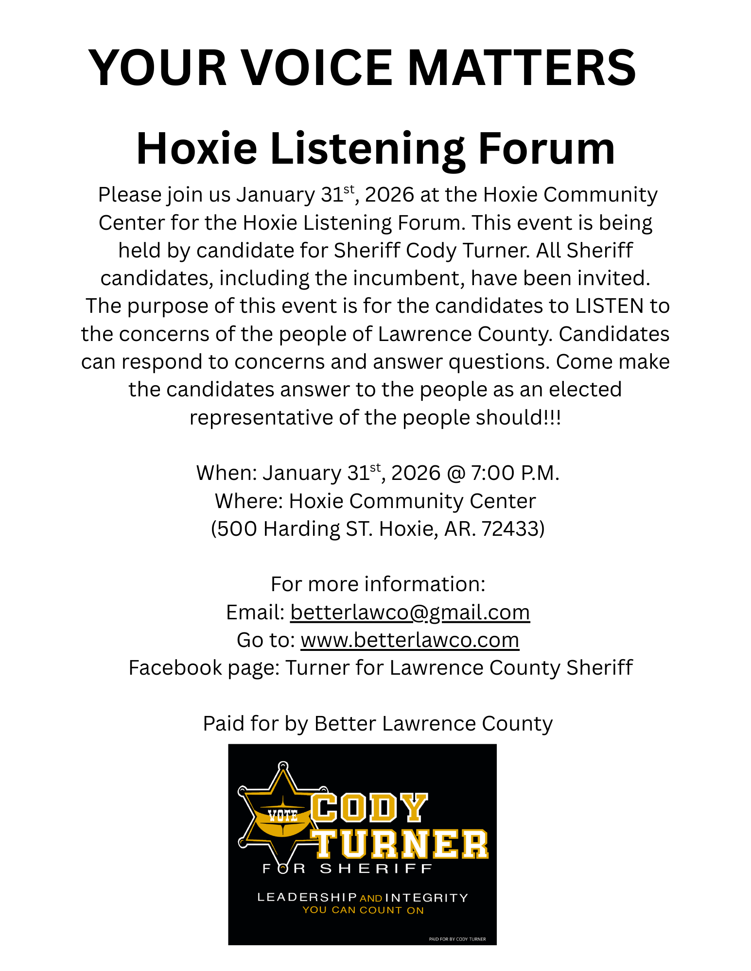 Candidate for Lawrence County Sheriff, Cody Turner has organized a “Listening Forum” in Hoxie scheduled for January 31st at 7pm at the Hoxie Community Center.