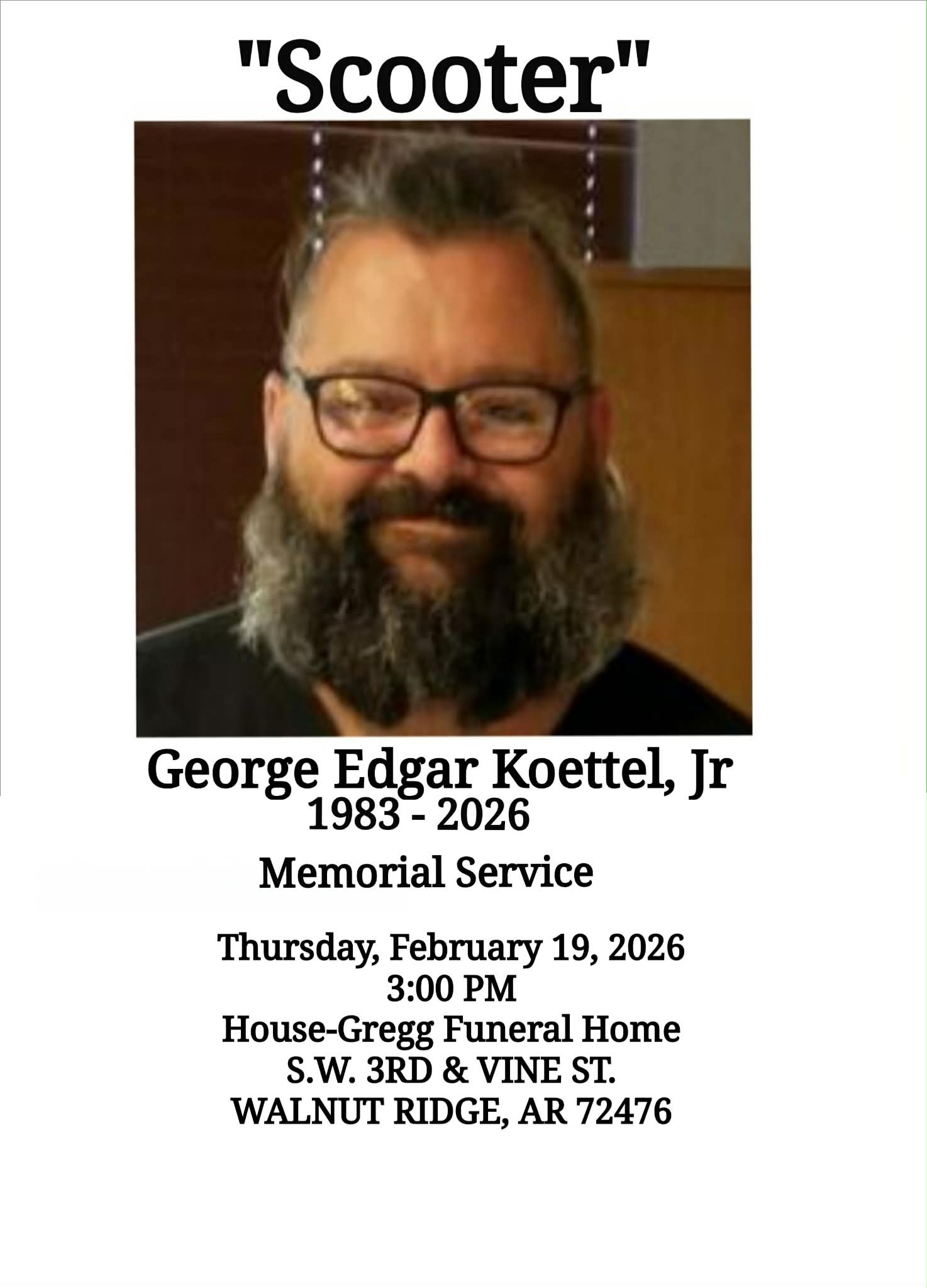 A memorial service will be held for George Edgar “Scooter” Koettel Jr. 1983-2026 will be held at