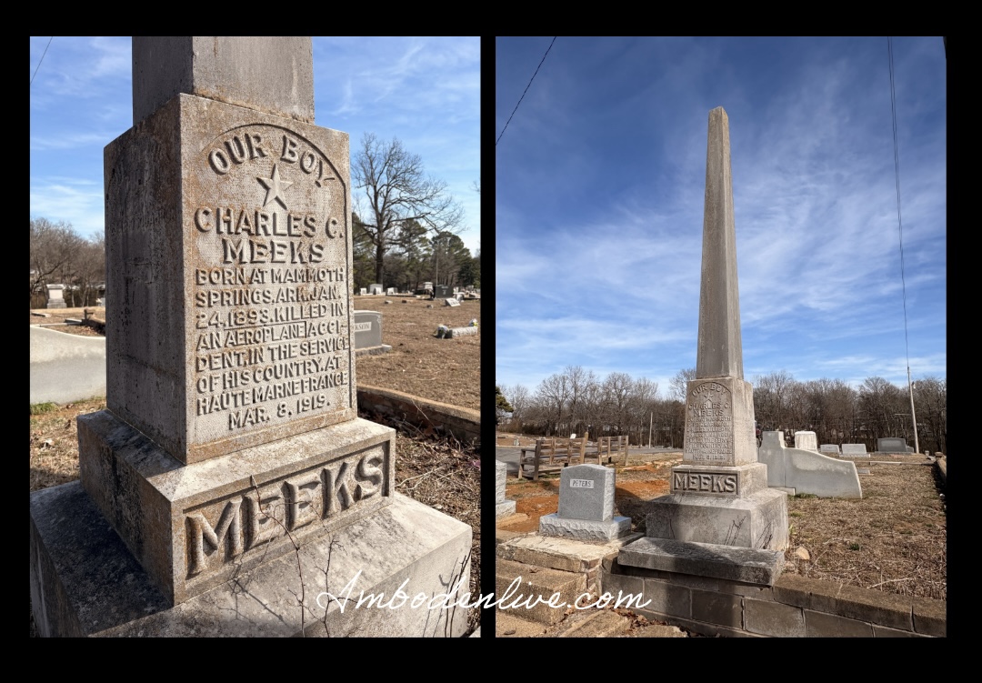 Charles C. Meeks, born 1893 died 1919 was marked on the stone but the more interesting part was where it stated “killed in an aeroplane accident in the service of his country.”