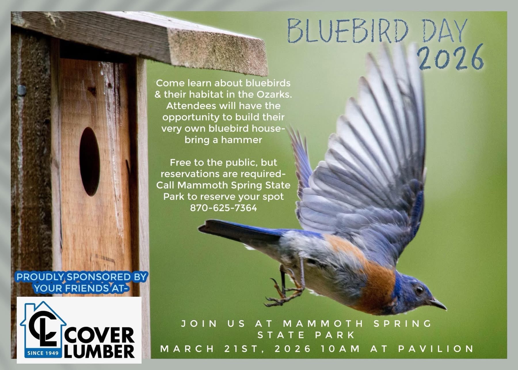 Bluebird Day 2026 at Mammoth Spring State Park is scheduled for Saturday, March 21st 10am. Reservations are required & space is limited.