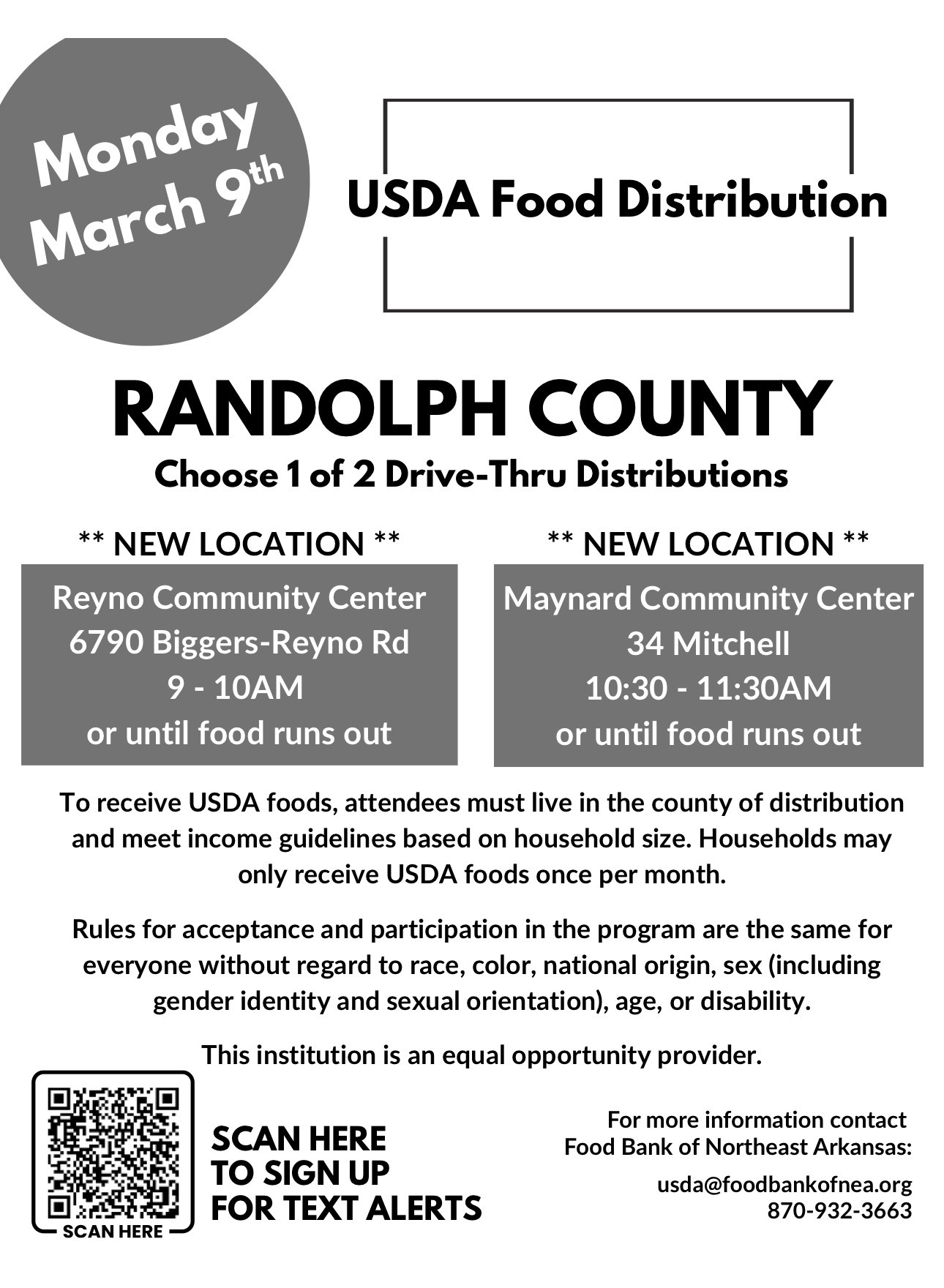 The Food Bank of Northeast Arkansas will host drive-thru USDA food distributions in Randolph County on Monday, March 9, 2026 at the following locations:
