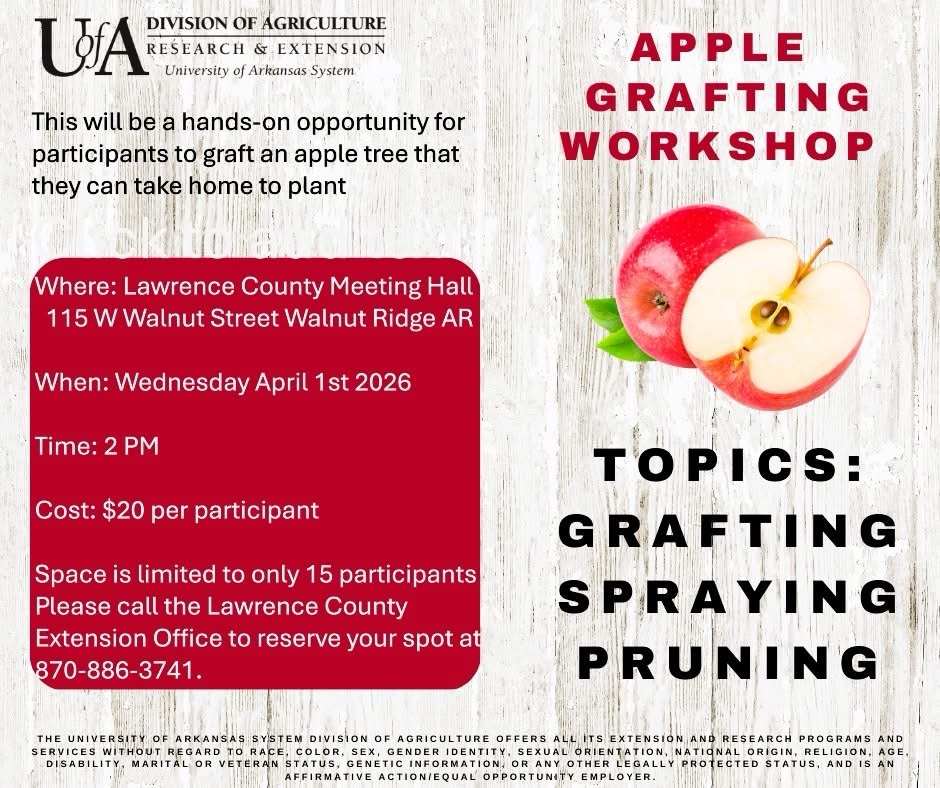 Each participant will get to graft a tree that they will be able to take home to plant. Space is limited to 15 participants so reserve your spot early. There will be a small cost of $20 per participant to cover expenses. Reserve your spot by calling the Lawrence County Extension Office at 870-886-3741. More information will be coming soon.