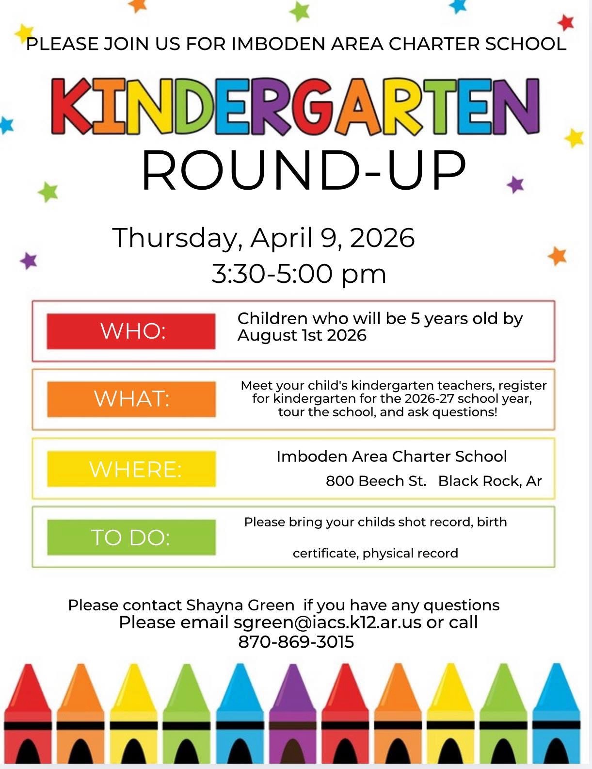 Imboden Area Charter School Mark your calendars! Kindergarten registration is April 9th. If you have an upcoming kindergartner and you would like to visit and tour the school stop by! If you can not make this date you may stop in anytime and sign them up!