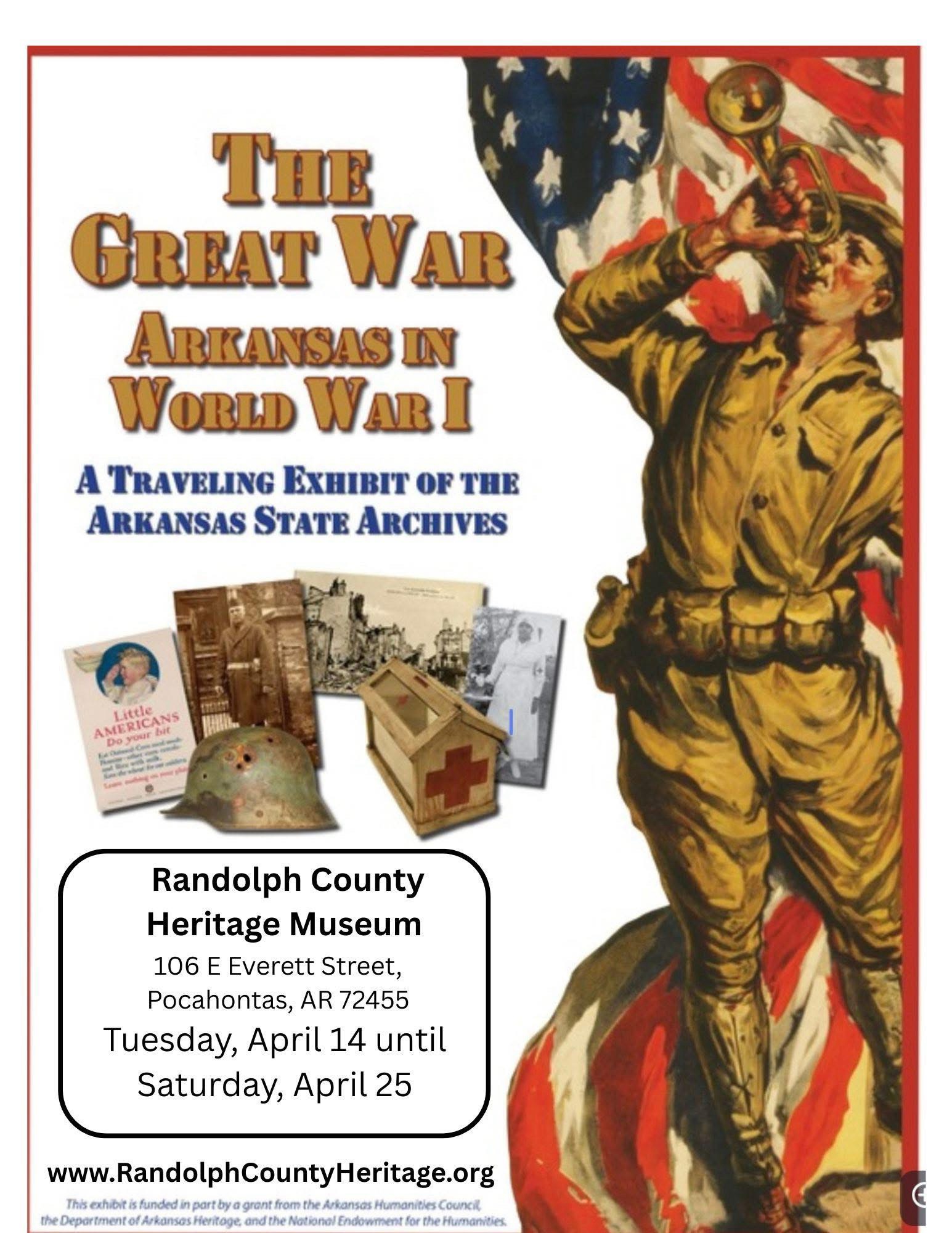 The Randolph County Heritage Museum in Pocahontas presents “The Great War-Arkansas In World War I” a traveling exhibit of the Arkansas State Archives, Tuesday April 14th through Saturday April 25th.