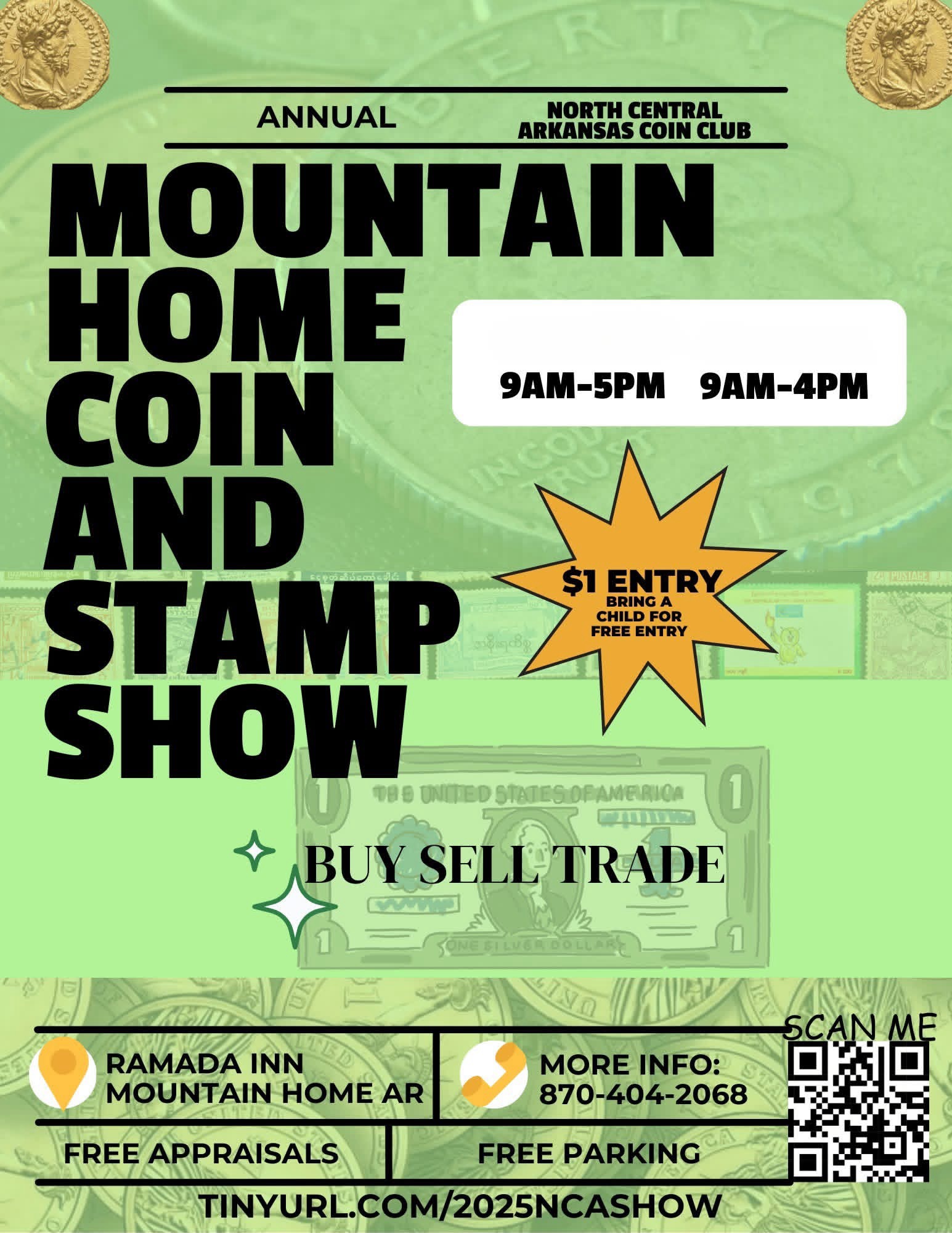 Annual coin and stamp show held at the Ramada Inn 1127 US Hwy 62, Mountain Home, 72653. September 04, 2026 from 9:00 am to 5:00 pm and September 05, 2026 from 9:00 am to 4:00 pm. 46th annual coin and stamp show. Buy, Sell & Trade. Free appraisals. Gold and silver, coins, stamps, postcards, tokens, coin and stamp supplies.